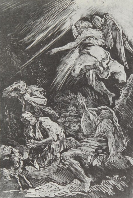 Влияние работ Микеланджело можно увидеть и в другой монотипии – «Благовещение пастухам» (ил. 10). В первую очередь предметом изображения в этом листе становится яркая эмоциональная реакция пастухов на явление архангела Гавриила, показанная не столько с помощью выражения лиц, сколько сложными позами, жестами, положением тел. И если приглядеться к фигуре пастуха в нижней части композиции, можно увидеть в ней сходство с иньюди Микеланджело – тот же изгиб тела и мощные формы. В то же время в фигуре архангела чувствуется влияние полотен другого великого художника Возрождения – Рафаэля Санти. Схожую позу можно увидеть в его картине «Святой Михаил» из Лувра. Это перенесение черт архангела Михаила на образ Гавриила придает ему воинственности: он словно заносит руку для броска, а линии, символизирующие лучи божественного света, напоминают скорее копье. Именно поэтому пастухи выглядят скорее испуганными, чем смиренно слушающими благую весть, и даже ягненок в нижнем левом углу композиции, кажется, пребывает в страхе и недоумении. Так техника монотипии позволяет соединить совершенно разные по происхождению изобразительные мотивы, примирив их благодаря экспрессии графического почерка.