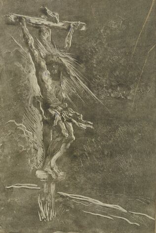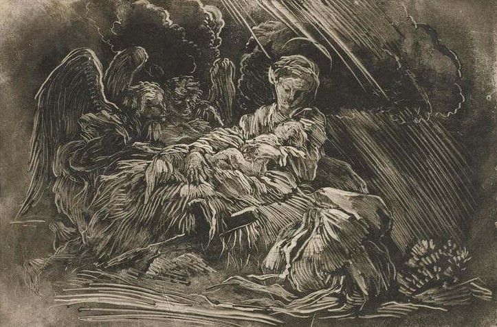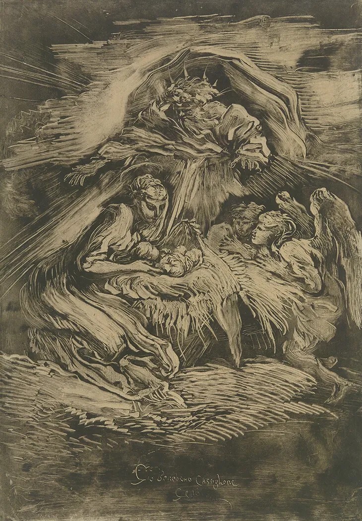 В другом изображении этой новозаветной сцены – «Рождество с Богом Отцом» (ил. 12) – образ Марии меняется, однако черты маньеризма проявляются не менее сильно и этому способствуют в том числе выразительные возможности техники монотипии. Четко различимые вытертые на чернилах волнообразные мазки усиливают изгиб фигуры Мадонны и еще больше удлиняют ее фигуру.