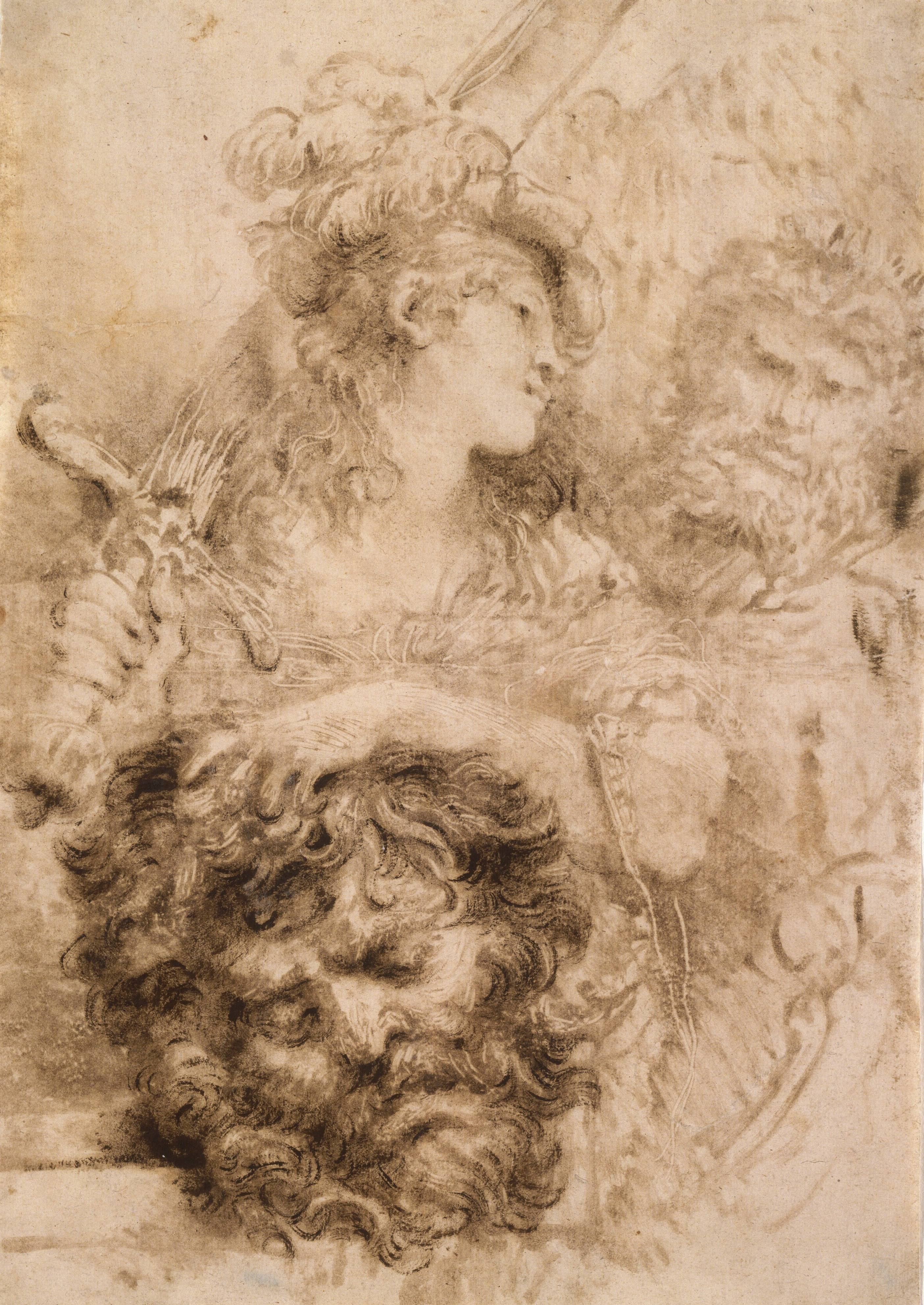 Но куда более сильное влияние на стилевую манеру Кастильоне в его римские годы оказало экспрессивное искусство Бернини, который как творческая личность был чем-то родственен ему по своему яркому темпераменту и склонности к эффектной импровизации. Типаж ангелов в листах с изображением Рождества Кастильоне Энтони Блант сравнивает со скульптурами Бернини, в частности – с изображением ангела в композиции «Экстаз святой Терезы» [Blunt 1945, p. 168]. В этом проявляется влияние римского барокко на монотипии генуэзца. Его можно проследить не только в использовании отдельных мотивов, но и в художественной манере Кастильоне в целом: экспрессии и свободе изображения, которые дает мастеру техника. Не могли пройти мимо взора художника и мастера барокко из Генуи – в монотипии «Давид с головой Голиафа» (ил. 13) при изображении Давида он, вероятнее всего, опирается на одноименное полотно Бернардо Строцци из Эрмитажа. Но этот лист также является важным показателем объединения и переплетения в творчестве Кастильоне испытываемых им влияний: при том, что положение меча на плече Давида и поясное изображение повторяет работу Строцци. Поворот головы библейского героя, шляпа с перьями, положение руки и в какой-то степени даже черты образа Голиафа схожи с Давидом Гвидо Рени из Лувра. В одной композиции соединяются мотивы из произведений генуэзского барокко и болонского академизма. Этот лист – настоящий шедевр виртуозной манеры рисования на камне и не менее виртуозного использования возможностей chiaroscuro за счет варьирования частоты штрихов, то рассеянных и воздушных, то плотных и сгущенных.
