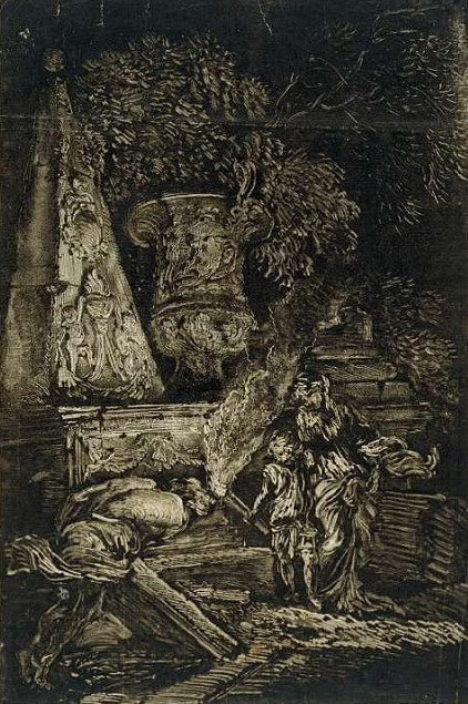 Подчеркнуть ощущение безвыходности ситуации позволяет и создаваемая Кастильоне атмосфера. Очевидно, что в графических техниках художник хотел изобразить именно ночную сцену: темный разрушенный храм, освещенный только светом факела. Это удалось ему в первую очередь за счет особых художественных возможностей, которые дает техника монотипии: вытирание краски пальцами позволяет мастеру передать полупрозрачные клубы дыма, поднимающиеся от огня, в то время как в офорте он может только показать очертания языков пламени.