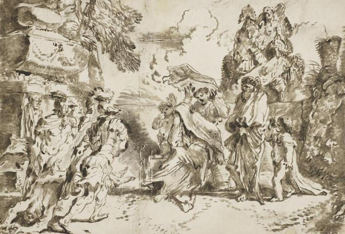 Влияние классицизма на творчество генуэзца и его монотипии не ограничивается при этом только тематическими заимствованиями, Кастильоне воспринимает и композиционные принципы. В последней монотипии, выполненной в 1660 году на неизвестный сюжет (ил. 16) (вероятнее всего, взятый из древней истории, об этом можно судить по одежде персонажей), действие разворачивается на переднем плане, где римские воины волокут тело человека к группе людей с ребенком. Деревья и античный саркофаг образуют кулисы. Кастильоне выстраивает таким образом театрализованную композицию, решенную по канонам классицистического искусства.