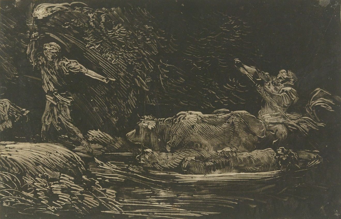 Ранние работы Кастильоне отмечены влиянием генуэзских художников вроде малоизвестного Синибальдо Скорца, с которыми ему довелось столкнуться в начале творческого пути. Через их посредничество он перенял у фламандских живописцев барокко вкус к показу анималистических мотивов. В монотипии «Ной и животные заходят в ковчег» (ил. 1) фигура Ноя в листе занимает скорее второстепенную роль – его практически не различить на фоне колоссальных изображений лошадей, овец и коз, оленя. Экспрессивная стилистика листа определяется теми возможностями свободной, практически импровизационной манеры рисования на поверхности металлической доски, которую давало использование техники монотипии. Другой пример такой графической импровизации – лист «Стадо у брода» (ил. 2), который характеризуется еще большей эскизностью выполнения, отличающей его от тщательно проработанных офортов эпохи Возрождения.