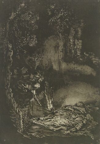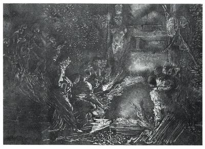 В свою очередь, в негативных монотипиях Кастильоне можно проследить влияние полотен Рембрандта с эффектом искусственного освещения (или, как раньше говорили, выполненных в манере «тенеброзо»). В «Воскрешении Лазаря» (ил. 6) и «Обнаружении тел святых Петра и Павла» (ил. 7) мы видим помимо вытертых линий изображения высветленное поле. Это создает особый светотеневой эффект, поскольку так возникает четкий источник яркого света в темной композиции. Более того, светлое поле позволяет выделить не только главный сюжетный элемент, но и символически ключевое место в композициях. Так, в обеих монотипиях источник света художник размещает непосредственно за телами святых, обозначая таким образом божественное свечение, исходящее от Петра и Павла и воскресшего Лазаря. Так особенности графической техники умело подключаются художником для усиления эмоционально-образной выразительности листа.