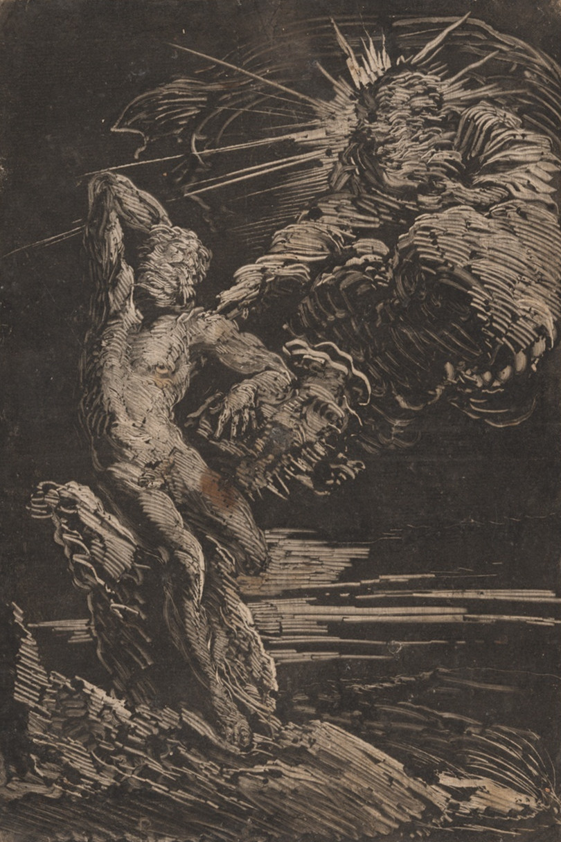 С новым комплексом влияний Кастильоне столкнулся во время работы в Риме в 1630-х годах. Большую роль в этом сыграло наличие образцов ренессансного и античного искусства. В монотипии «Сотворение Адама» (ил. 9) прообразом для изображения первого человека становится «Умирающий раб» Микеланджело. При том, что Кастильоне усиливает изгиб тела, очевидно, что положение фигуры и даже ее опора взяты мастером из скульптуры. Однако его голова отличается от ренессансного прототипа, в ней прослеживается сходство с более ранним памятником – «Лаокооном и его сыновьями». По интенсивности выражения эмоций он проводит параллели между умирающим человеком и первым созданным. Для фигуры Бога-отца в облаках на фоне четко очерченной формы аналогией могло послужить также произведение Микеланджело – на этот раз знаменитые росписи потолка Сикстинской капеллы. Сью Велш Рид отмечает, что из-за того, что во фреске Адам является полноценным участником процесса творения, а в листе Кастильоне он предстает скорее произведением искусства великого мастера – в этом случае Создателя. В трактовке темы генуэзец опирается на языческий миф о сотворении первого человека Прометеем [Welsh Reed 1991, p. 72]. Согласно античному мифу сначала он сформировал из глины тело, после чего гений вдохнул в него жизнь, и затем Минерва дала человеку душу. Рид сравнивает монотипию с рисунком Пармиджанино, в котором Прометей одной рукой тянется к солнечной колеснице, а другой поддерживает свое творение, пока больше напоминающее марионетку. Исследователь однако не утверждает, что Кастильоне мог видеть эту работу.