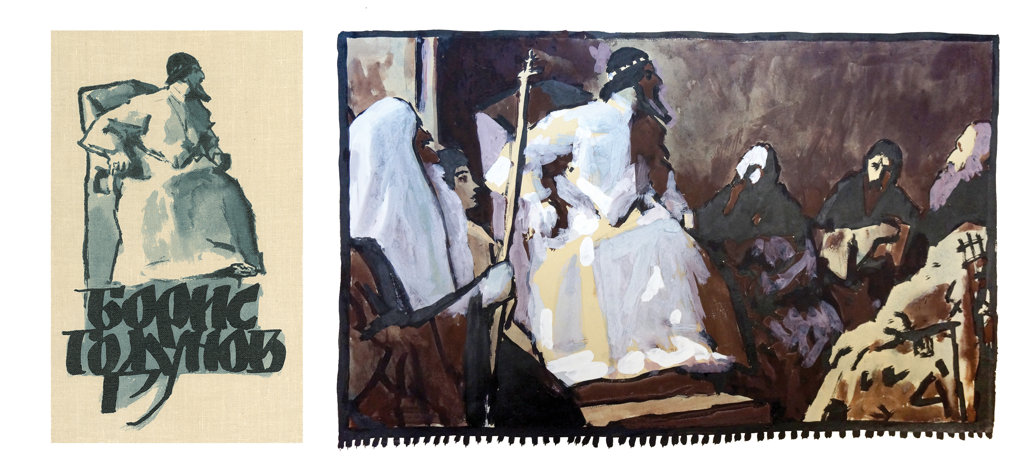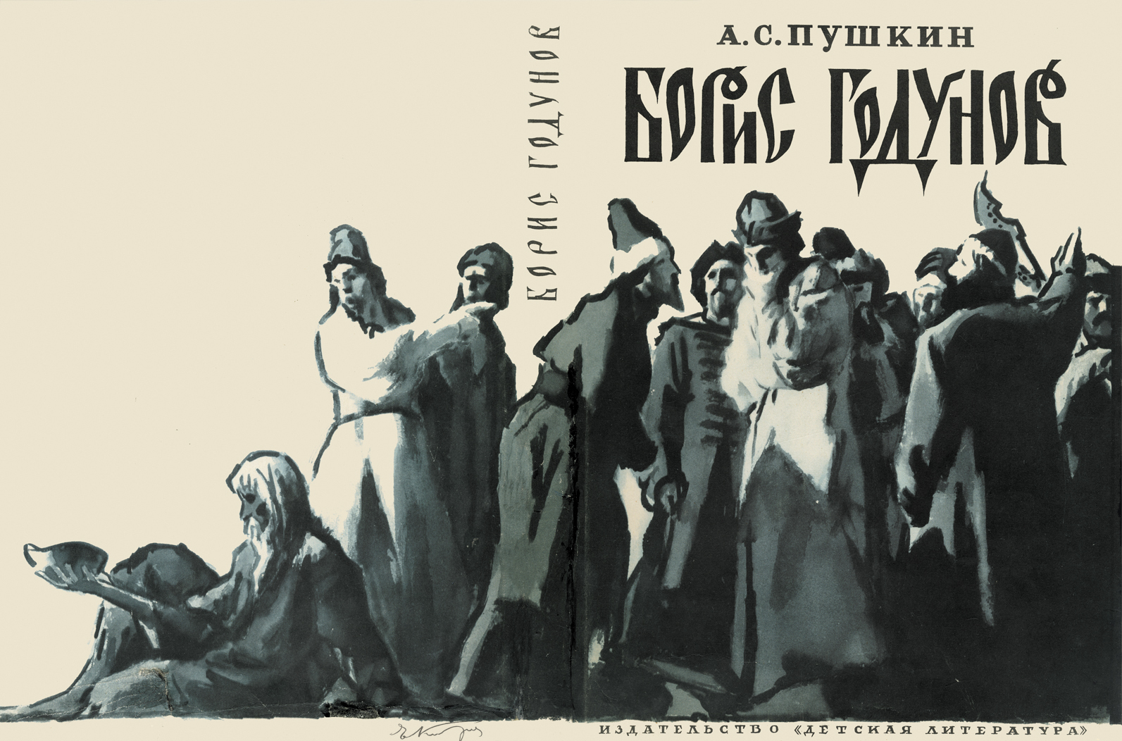 Вопреки полюбившейся художнику литографии – технике исполнения, главенствующей в его творчестве, в работе над этой серией Е.А. Кибрик использует чернила (черные, зеленые и голубые), тушь и гуашь. «Стиль же рисунков, – говорил художник, – сложился на основе тщательно прорисованной композиции и быстрого, энергичного исполнения ее пером и кистью. Вот тут уже во время исполнения невозможны были никакие переделки из-за материала – чернил для авторучки, – они не позволяют дважды прикоснуться к одному месту, – от воды они неудержимо расползаются. Но это и дисциплинировало, не позволяя ошибаться, а если ошибался, то начинал сначала, до тех пор, пока не удавалось без промахов выполнить весь рисунок с начала до конца» [Кибрик 1984, с. 199]. В конфликте народа и власти поэт видел «одну из самых драматических эпох новейшей истории» [Пушкин 1962, с. 300]. И эти политические и социальные противоречия между власть имущими и простым людом, переведенные в графический язык художественного образа, возникают уже на суперобложке издания, задавая определенный камертон всему будущему иллюстративному ряду, размещенному на страницах книги. Е.А. Кибриком запечатлен исторический момент духовного самоопределения народа. Создавая атмосферу внешней сдержанности, художник передает внутреннее напряжение народных масс, их сомнения, неуверенность, размышления и гнев через жесты и динамичные ракурсы. При кажущейся обобщенности композиционного решения лица и фигуры людей сохраняют индивидуальные черты. Вслед за монолитной и внушительной иллюстрацией суперобложки на переплете возникает одинокая маленькая фигура сидящего на троне царя Бориса.