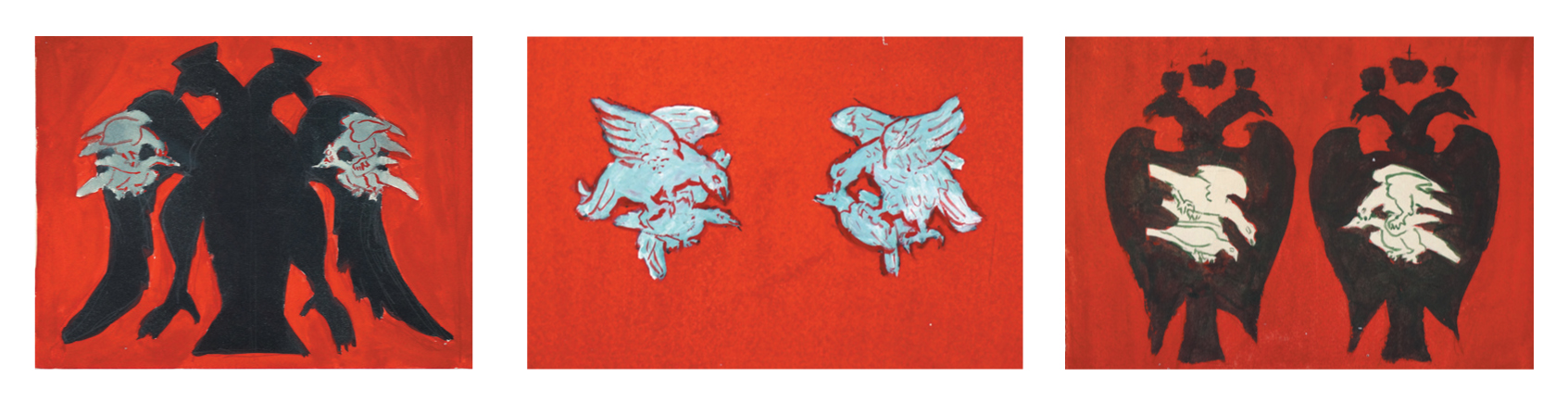 Для соединения заставки с названием сцены художнику была необходима небольшая, но емкая по своей значимости графическая деталь. Элементы древнерусского орнамента Е.А. Кибрик искал везде – и в Теремном дворце, и в соборе Василия Блаженного, и на могиле Кочубея в Киеве. В результате необходимым связующим звеном стал цветок, вписанный в круг. «В палатах Теремного дворца в Большом Кремлевском дворце я нашел множество неопубликованных деталей, – вспоминает график. – …там я увидел на стенах белые лепные изображения в особых картушах. Везде на них изображены были хищники – звери и птицы, поражающие свою добычу. Я подумал: какие же это выразительные символы борьбы за власть...» [Кибрик 1984, с. 197]. Так появились концовки, сделанные Кибриком к двадцати трем сценам.