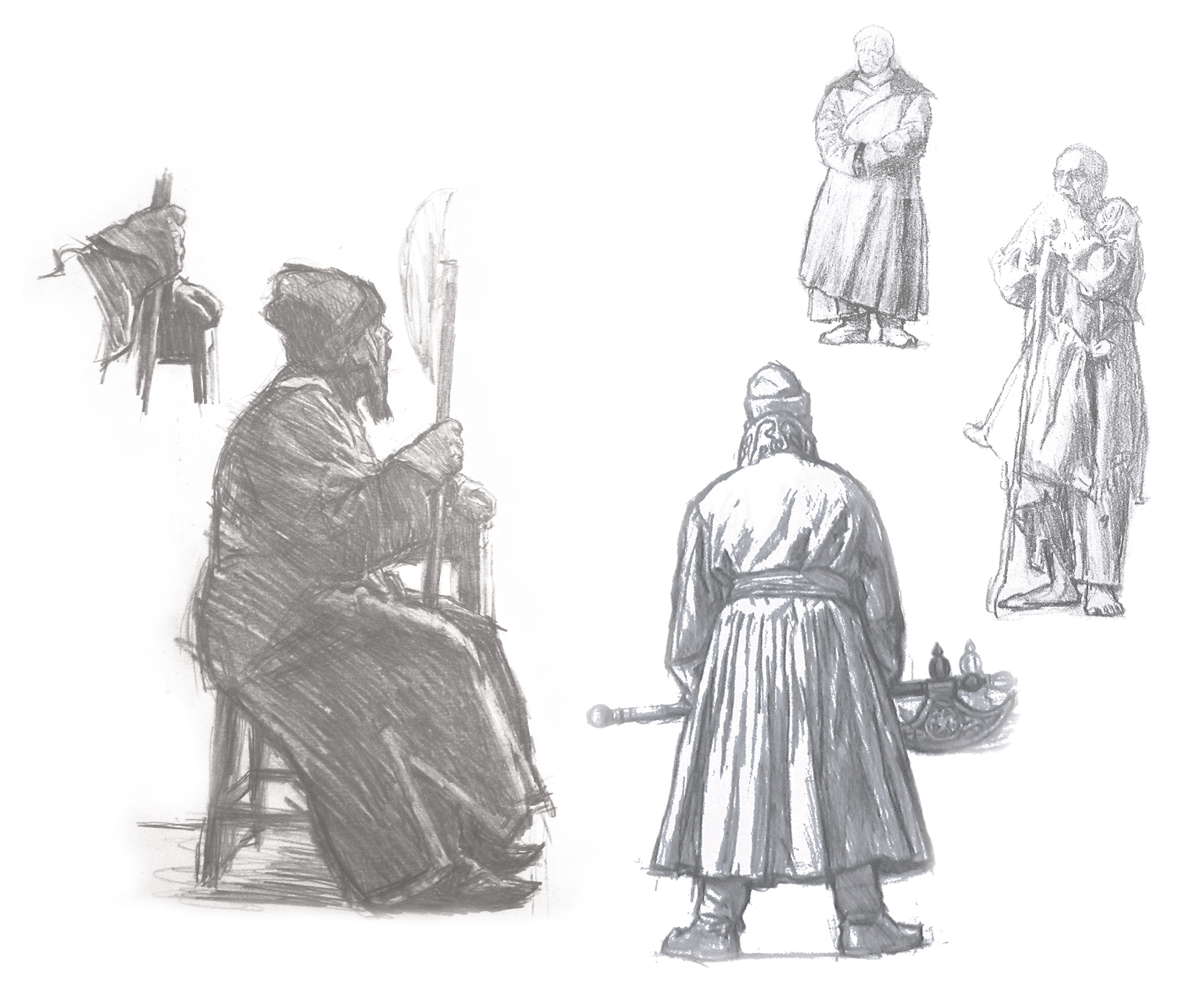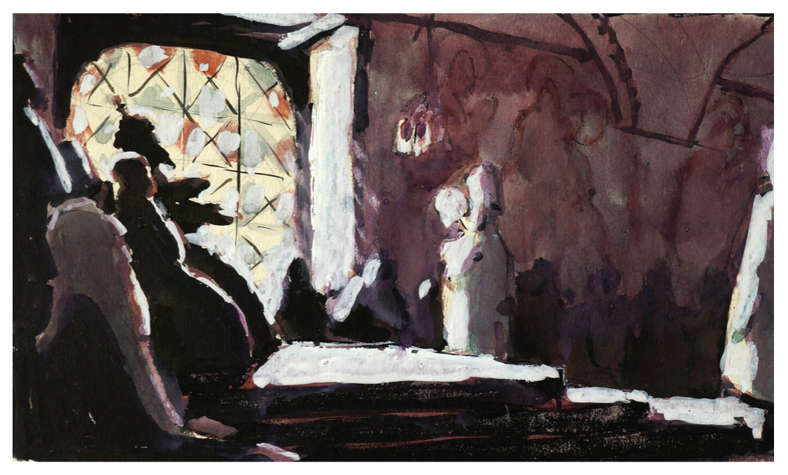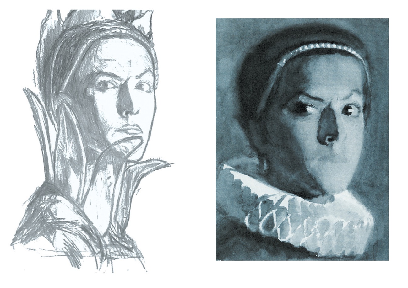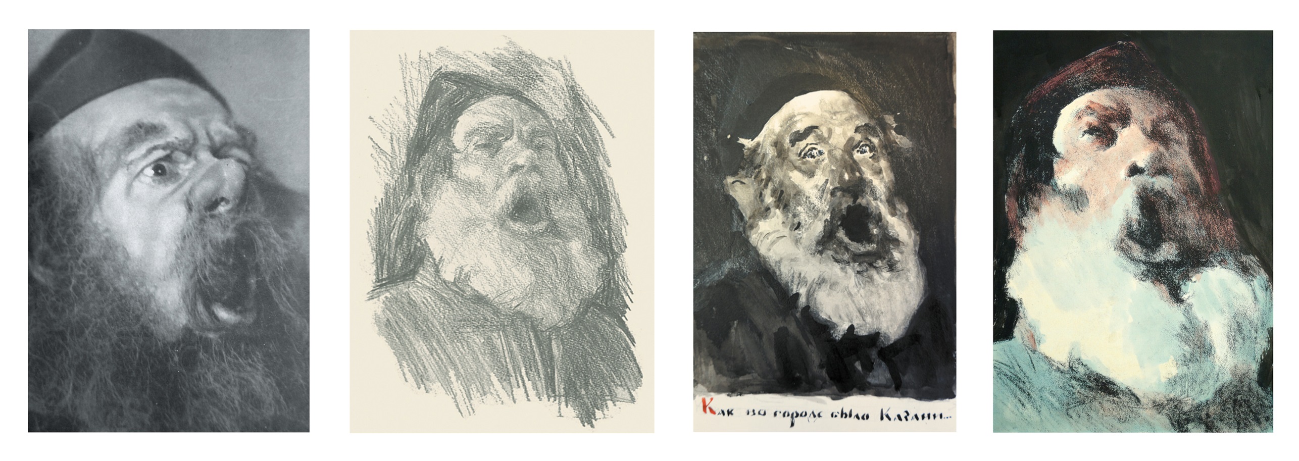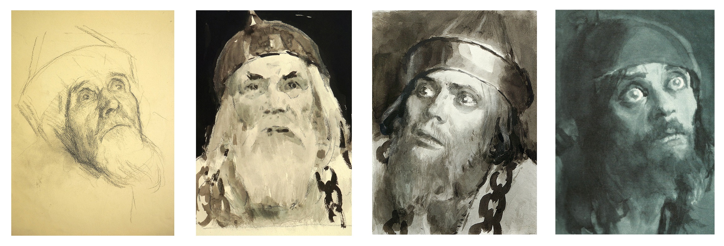 «По театральным традициям, – вспоминает Кибрик, – Шуйский всегда изображался с узкой русой бородой. Я согласился с этим, так как эта борода придает что-то лисье, пронырливое облику хитреца Шуйского. Но Шуйский не только хитер, он умен, он “премьер-министр”, крупный государственный деятель. Он Рюрикович, имеющий право на русский престол (и впоследствии он русский царь), вельможа – его тип лица должен быть породистым, аристократическим, и в то же время он “лукавый царедворец”, человек характера мелкого, да и сам он об этом говорит Воротынскому в первой сцене, где речь идет о Борисе: “Он смел, вот все, – а мы...” В этой сцене я его изображаю в момент, когда он говорит о Борисе свысока, надменно: “вчерашний раб, татарин”. Я нарисовал много голов Шуйского в поисках наибольшей выразительности и остановился тогда, когда нашел его презрительно прищуренный взгляд. Долго я искал модель для Шуйского. Были очень выразительные и значительные лица. Казалось, что вот-вот получится то, что я ищу, но нет – выходил образ то купца, то подъячего, то характера однозначного, лишенного сложности, обязательной для образа Шуйского. Многих я рисовал и в конце концов с легкостью сделал Шуйского с артиста МХАТ Максима Осиповича Чернобровцева, сохранив даже его портретные черты. Это был тот редкостный случай, когда модель буквально соответствовала задаче» [Кибрик 1984, с. 187–188].