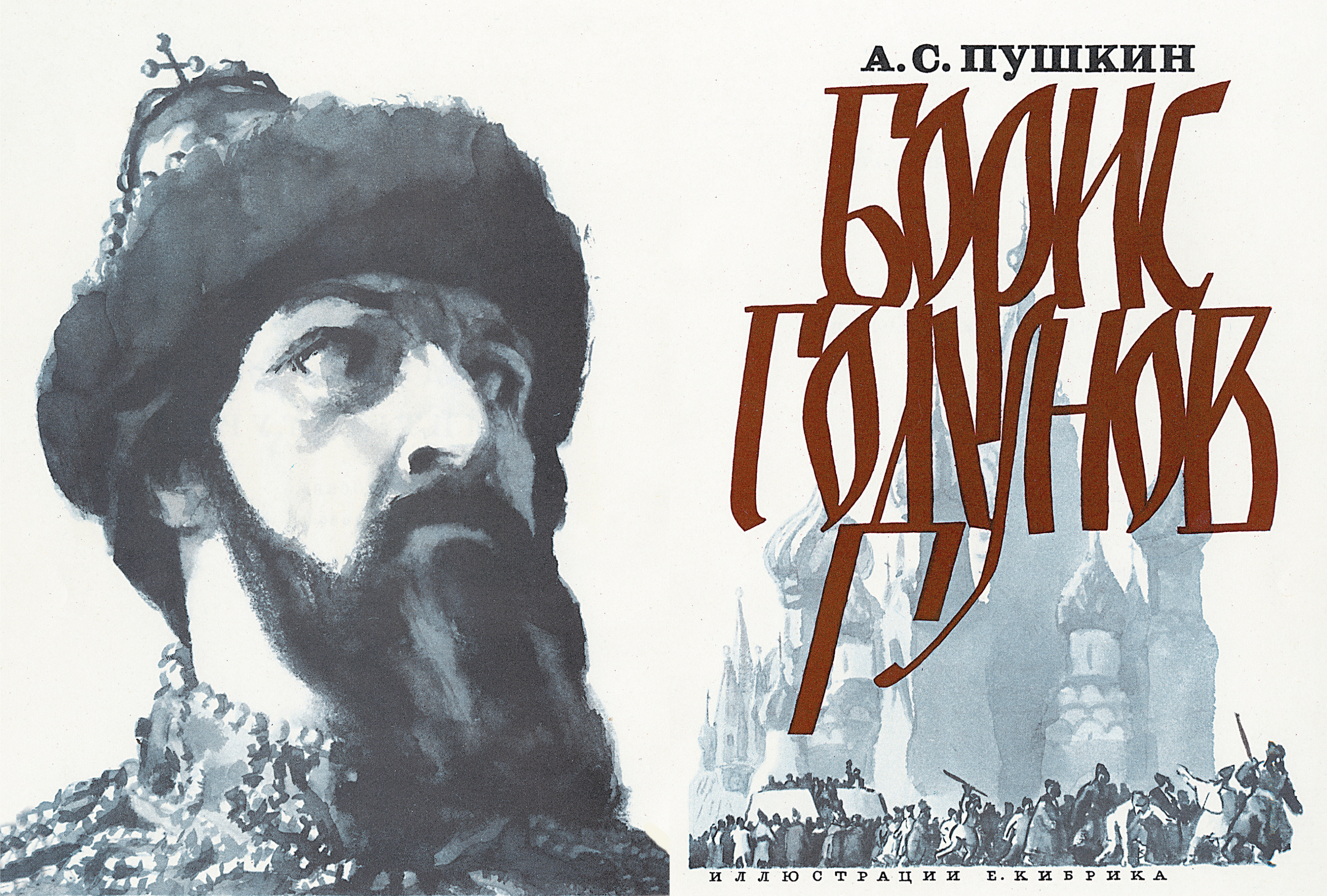 В 1965 году в издательстве «Детская литература» была напечатана драма А.С. Пушкина «Борис Годунов» с иллюстрациями Е.А. Кибрика. Обращение графика к трагедии «Борис Годунов» неудивительно, ведь эпоха правления русского царя наполнена легендами и домыслами, тайнами и загадками, о которых до сих пор полемизируют ученые и историки. Исследователь отечественной истории Р.Г. Скрынников так говорит о личности Бориса Годунова: «Его неслыханное возвышение и трагический конец поразили воображение современников и привлекли внимание историков, писателей, поэтов, художников, музыкантов» [Скрынников 1979, с. 3]. Драматические события, происходившие на рубеже XVI–XVII столетий и сопутствовавшие жизни русского царя, нашли свое отражение в трагедии А.С. Пушкина «Борис Годунов».