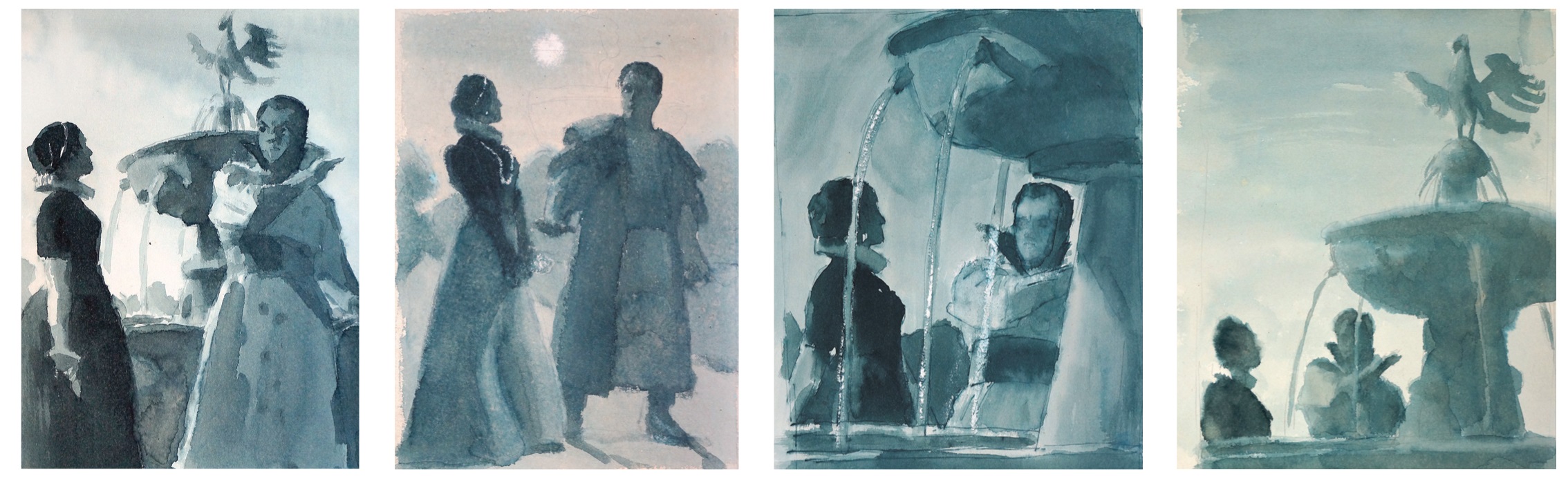 В иллюстрации «Ночь. Фонтан в саду» раскрываются новые стороны характера героя. Перед нами предстает совершенно обновленный художественно-графический образ мужчины в ожидании своей возлюбленной. Меняются и черты, определяющие характер речи Самозванца, несколько лет прожившего в Польше и теперь выдающего себя за царевича Димитрия. Встреча у фонтана дала Е.А. Кибрику колоссальные возможности, поскольку в этом эпизоде явлены истинные качества каждого из героев. Лиризм, впервые появляющийся в таком объеме лишь здесь, отражает представления о Лжедмитрии самого автора трагедии: «Любовь весьма подходит романтическому страстному характеру моего авантюриста» [Пушкин 1996, с. 481]. Избалованная и расчетливая польская аристократка Марина Мнишек поражена и порицает Димитрия за то, что он не сумел скрыть от нее свой обман. В Марине Мнишек, единственном женском образе в галерее психологических портретов, созданных к «Борису Годунову», художник раскрывает перед зрителем редкий тип честолюбивой женщины. «Для образа Марины, освещенной луной, – вспоминал Е.А. Кибрик, – я рисовал разных девушек. Марина у Пушкина волевая, рассудочная, готовая ни перед чем не остановиться в своем страстном желании стать русской царицей. Для ее образа у меня не было основной модели, хотя рисовал я многих и многих. Он сложился как-то сам собой» [Кибрик 1984, с. 186]. Графическими интонациями и смысловыми оттенками Кибрик добивается необходимого прочтения образа Марины. Все внимание приковано к устремленному на Самозванца взгляду, полному гнева, честолюбивых помыслов, злобы и раздражения. Вводя активную светотень, Е.А. Кибрик выявляет абрис лица белым кружевным воротником.