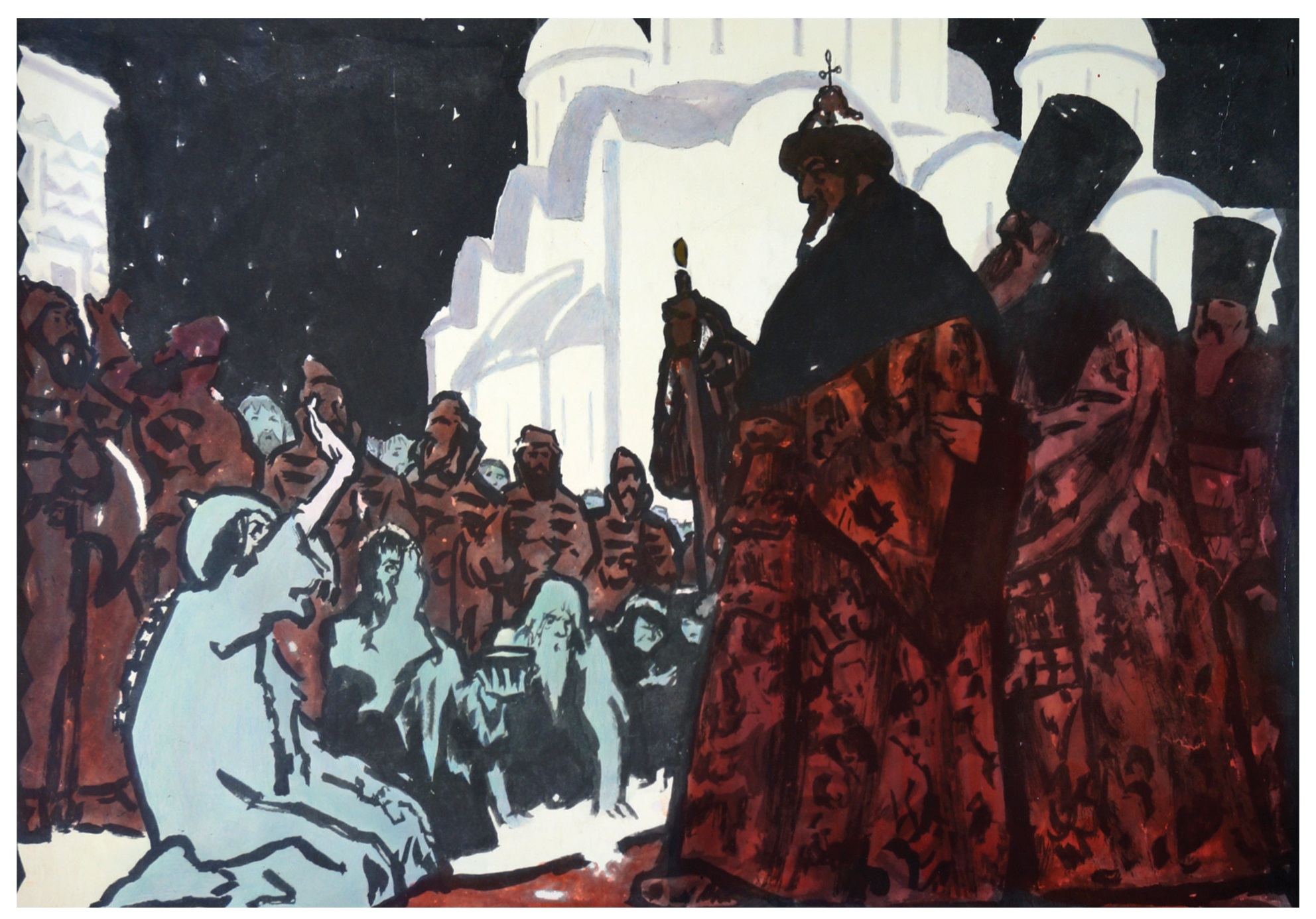 Особое внимание график уделяет сцене с второстепенным, но очень важным для сюжетной линии трагедии персонажем – юродивым Николкой. Изображая обличителя царя Бориса как убийцы царевича Димитрия и глашатая Божией воли, Е.А. Кибрик выделяет Юродивого из народной толпы, отводя особое место и особое значение как личности блаженного, так и его роли в трагедии. В одной из глав «Истории государства Российского» Н.М. Карамзина было сказано: «Тогда же был в Москве Юродивый, уважаемый за действительную или мнимую святость: с распущенными волосами ходя по улицам нагой в жестокие морозы, он предсказывал бедствия и торжественно злословил Бориса; а Борис молчал и не смел сделать ему ни малейшего зла, опасаясь ли народа, или веря святости сего человека» [Карамзин Н.М. История государства Российского. Том X]. Не надеясь на искупление своей вины перед Богом, царь взывает к Юродивому: «Молись за меня, бедный Никола» [Пушкин 1965, с. 113]. Эпизод приобретает кульминационный характер: в трагической глубине сцены и обвинении Юродивым царя в кровавом преступлении против царевича Димитрия отражается совесть народа. И здесь иллюстрация становится откликом на слова – на бумаге рождается кибриковское понимание образа Юродивого, балансирующего на тонкой грани между безумием и святостью. Художник видел в его фигуре олицетворение народной правды, несгибаемого духа, торжествующего над жалкой внешностью.