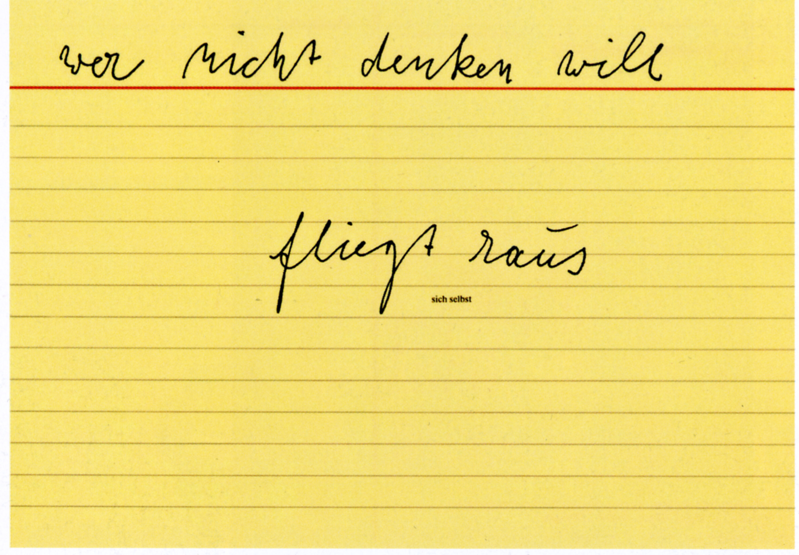 Неслучайно один из его ранних рисунков назывался «Мышление» (Коллекция «Йозеф Бойс – Ева, Венцель, Джессика Бойс», издательство «Билд-Кунст», Бонн). В 1977 году одна из повседневных «записок самому себе», которую Бойс вместе со своим кёльнским другом Клаусом Штэком растиражировал в виде открытки, провозгласила: «кто не хочет думать, тот вылетает» (Коллекция “Artists Rights Societz”, ARS, Нью-Йорк, “VG Bild-Kunstˮ, Бонн) (ил. 3).
