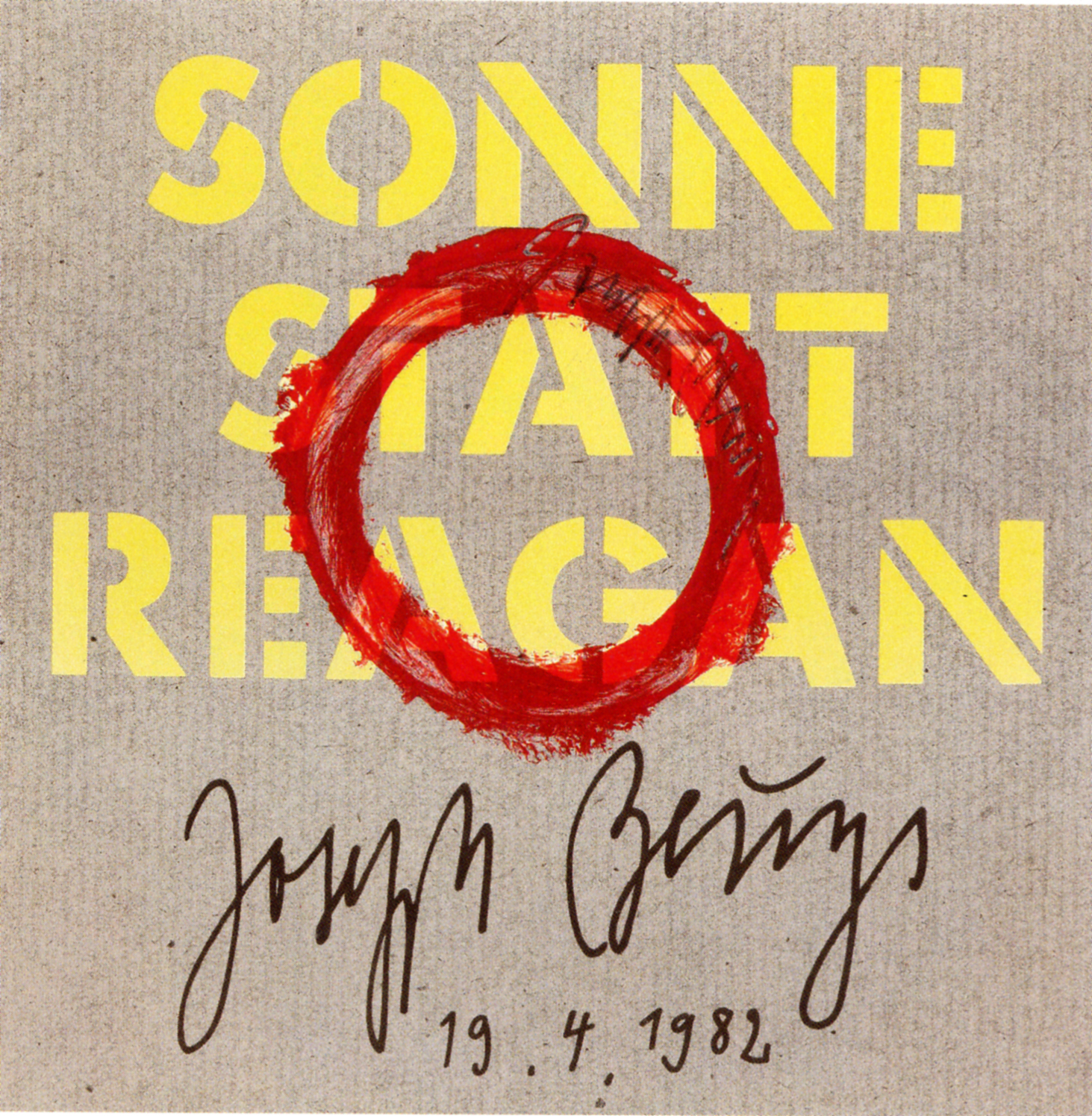 В июле 1982 года Бойс вышел на сцену в неизменном одеянии – шляпе и рыбацком жилете и как вокалист исполнил веселый шлягер. Песенка, написанная рекламными копирайтерами «зеленых» – Аленом Томе и Манфредом Беккером – называлась «Солнце вместо Рейгана». Это были куплеты со словами протеста, направленного против военной политики американского президента Рональда Рейгана, вредоносных холодных войн и русофобии. Музыкальный хит Бойса прозвучал в популярной телевизионной музыкальной программе АRD «Бананы». Спустя почти тридцать лет – в 2009 году – известный немецкий радиоведущий и театральный режиссер Юрген Катнер сделал новую презентацию исторической видеозаписи песни, исполненной художником Йозефом Бойсом, в прославленном театре Берлина – на сцене «Фольксбюне»[1]: