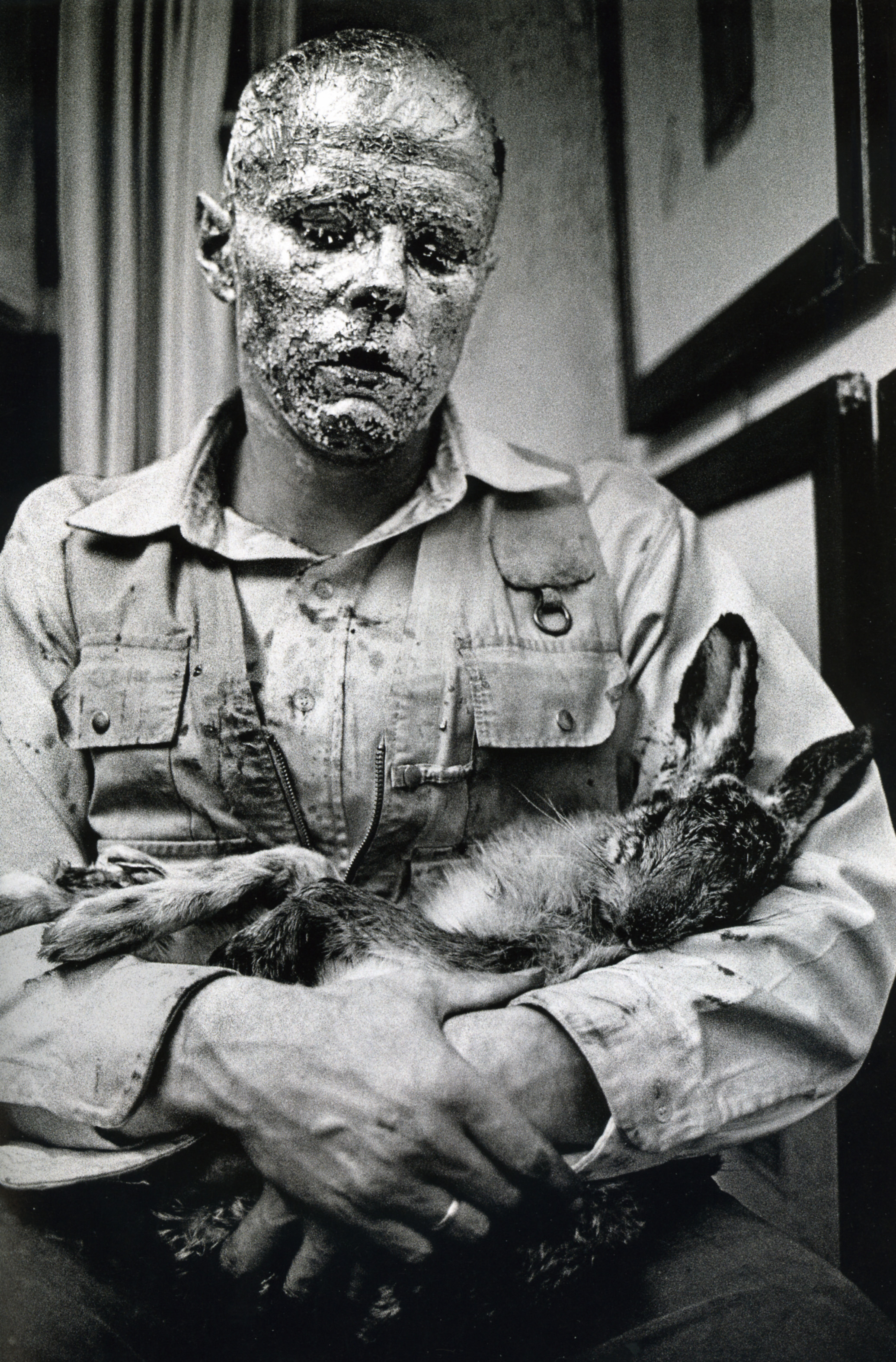 «Как объяснить зайцу картины?» – вопрошал Бойс в одном из своих перформансов 1965 года, когда провел художественную акцию с мертвой тушкой зайца на руках. Художник появился в дюссельдорфской галерее Альфреда Шмелы с загримированным лицом, густо намазанным медом и сусальным золотом (ил. 6). Он говорил об антропософии, о некой внутренней силе, которая сливается со всей вселенной, о микро- и макрокосмосе: «ибо в них непосредственно проявляется духовно-душевное» [Штайнер 2022, с. 106–107]. Для Бойса – изнутри антропософской картины мира – жизнь и смерть оказывались равноценными компонентами, включенными в процесс эволюции Природы. Идею эволюции он наделял высшей ценностью. Тушка мертвого зайца рассматривалась абстрактно – как знаковый элемент Микрокосмоса и во взаимосвязи с Макрокосмосом, словно некий талисман. Заяц был интеллектуальный и любимый персонаж художника, лидер партии животных в мифической «Евразии». В другой раз в акции был задействован живой койот, а еще были олень и пчелы.
