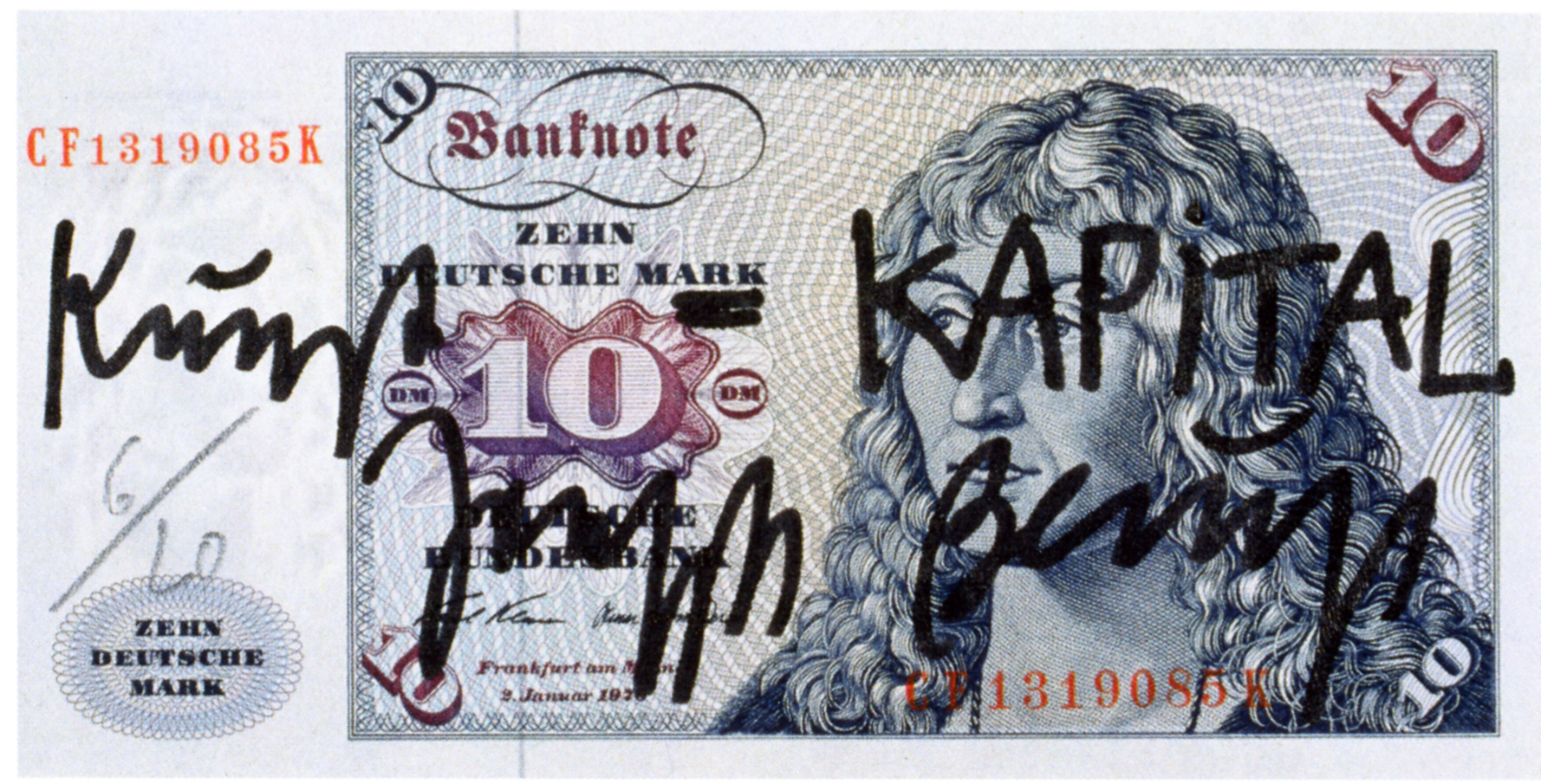 Произведение Бойса «Нейлоновые деньги» (1979) должно было вдохновить к тому, чтобы вовсе отказаться от денег. Ибо плохо, что они имеют власть над людьми. «А настоящий капитал – это искусство», – спорил он с теорией Карла Маркса. Бойс провел художественную акцию, во время которой публично надписал купюры немецких марок: «Искусство=капитал» (Kunst=Kapital, 1979, издательство Edition Staeck, Гейдельберг). Так он утверждал, что настоящим капиталом может быть только искусство (ил. 7).