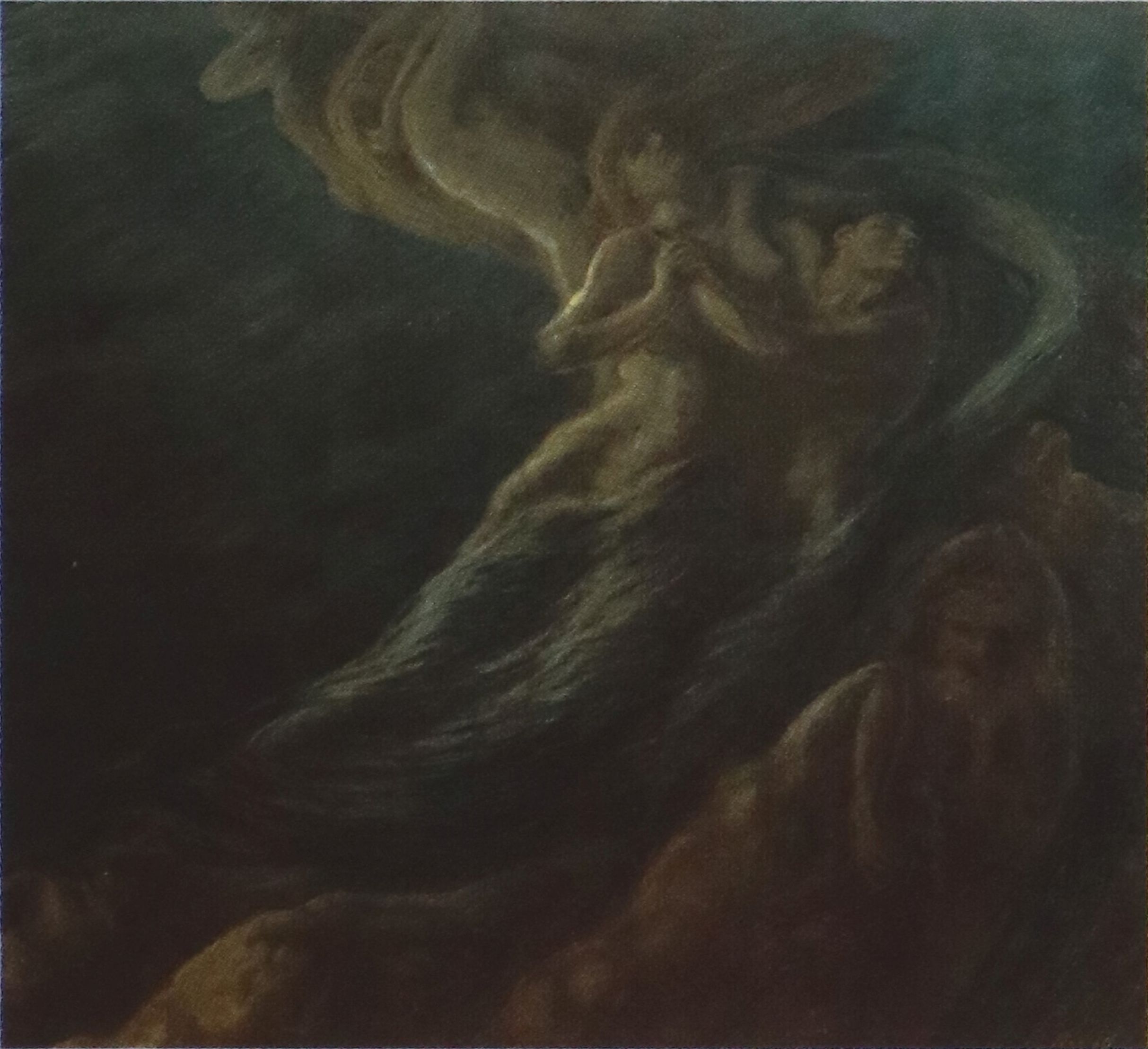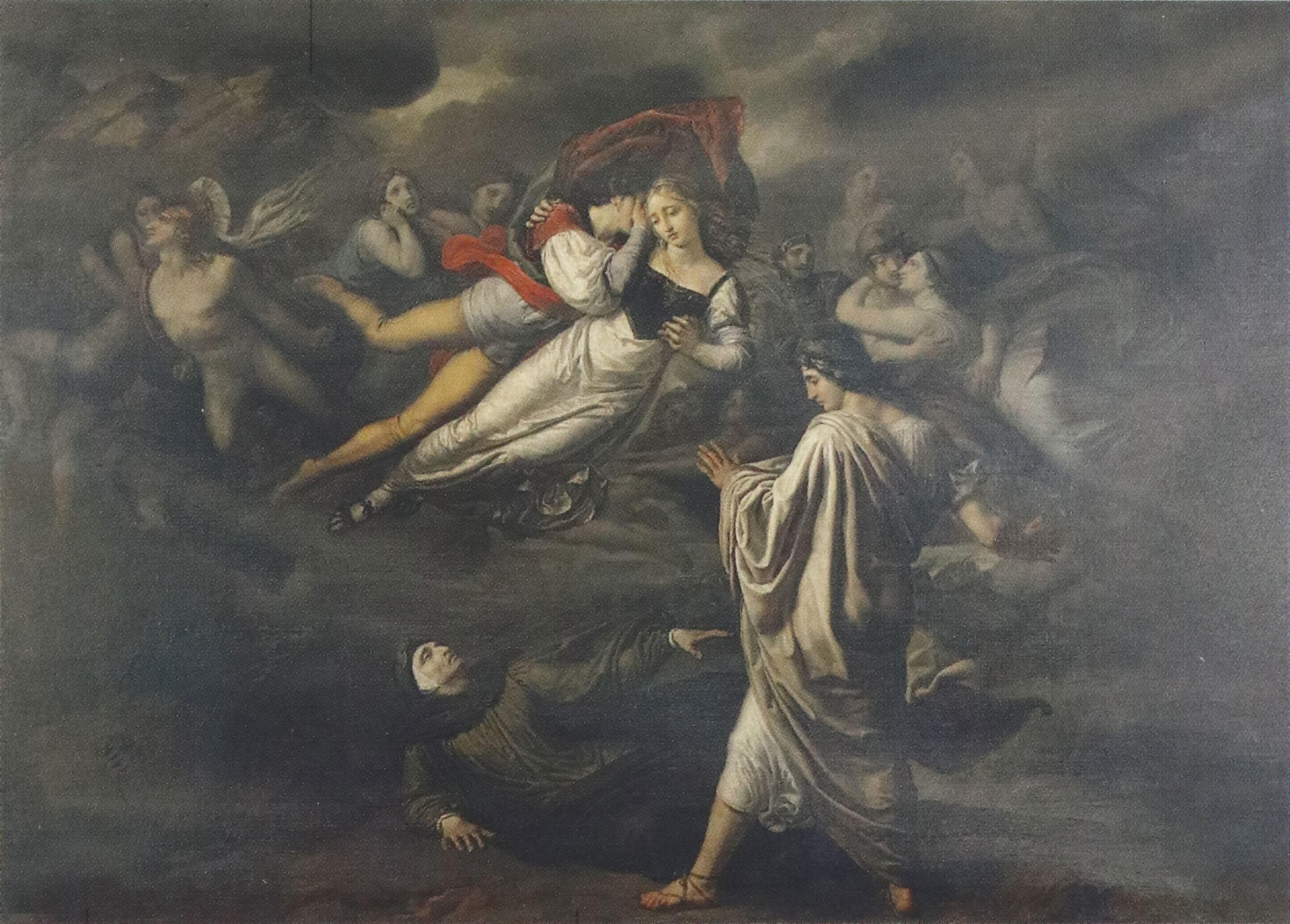 Витале Сала принадлежал к литературно-художественному направлению «миланская скапильятура» (scapigliati – растрепанные), живописцы которого обращались к историческим и литературным сюжетам, писали портреты современников, как романтиков их прежде всего интересовала передача чувств персонажей. Для своей картины «Паоло и Франческа» (1823, Пинакотека Брера, Милан) (ил. 5) Витале Сала избрал эпизод из Пятой песни «Ада» о любви двух свояков. В ней Данте беседует с грешной душой Франчески да Римини, дочери правителя Равенны, выданной замуж за хромого Джанчотто Малатесту, полюбившей его младшего брата Паоло, за что была убита ревнивцем. Поэт осуждает эту любовь, и художник изображает двух любовников в кругу подобных греховных душ, парящих «во мгле зловещей и тлетворной» [Данте Алигьери 2020, с. 25]. Выслушав воспоминания грешницы, поэт лишился сознания: «Пока она так говорила нам / Другая тень в тоске невыразимой / Рыдала так, что жалостью томимый / Сознания я вдруг лишился там» [Данте Алигьери 2020, с. 27]. И художник весьма наглядно изображает это. Любовь для Данте и художника романтического направления была связана не только с рождением вдохновения, но и со страданием.