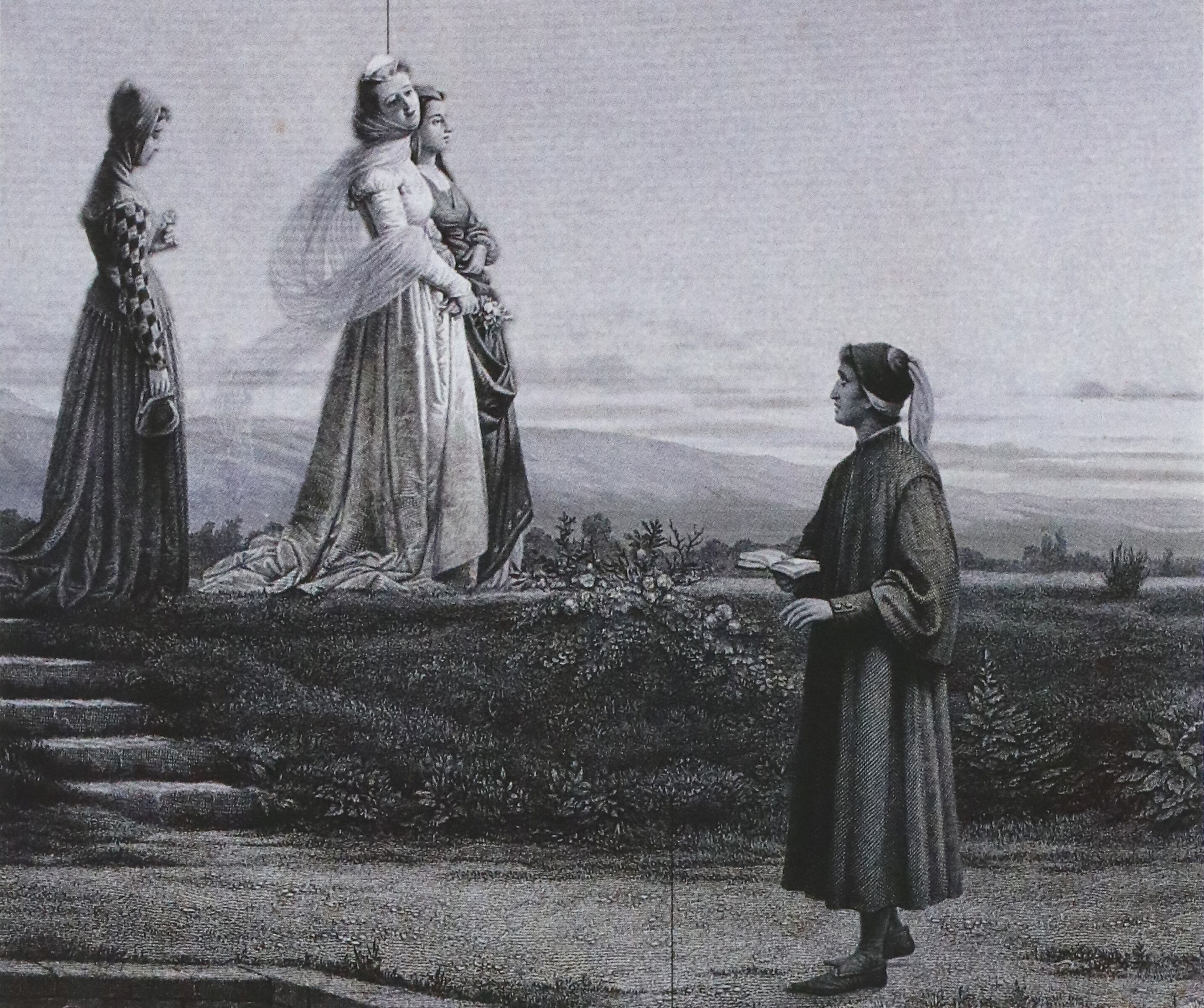 На картине Аньоло Парадизи «Встреча Данте и Беатриче» (ок. 1850, Национальная галерея современного искусства, Рим) (ил. 3) изображен эпизод, описанный во второй главе «Новой жизни». В ней описывается явление Данте «чудесной донны между двух благородных дам постарше»: «Проходя по дороге, она обратила свой взор туда, где я стоял; и по несказанной доброте своей, которая теперь получила свою награду в вечности, она поклонилась мне так приветливо, что мне показалось тогда, словно я вижу все пределы блаженства» [Данте Алигьери 2018, с. 33–34].