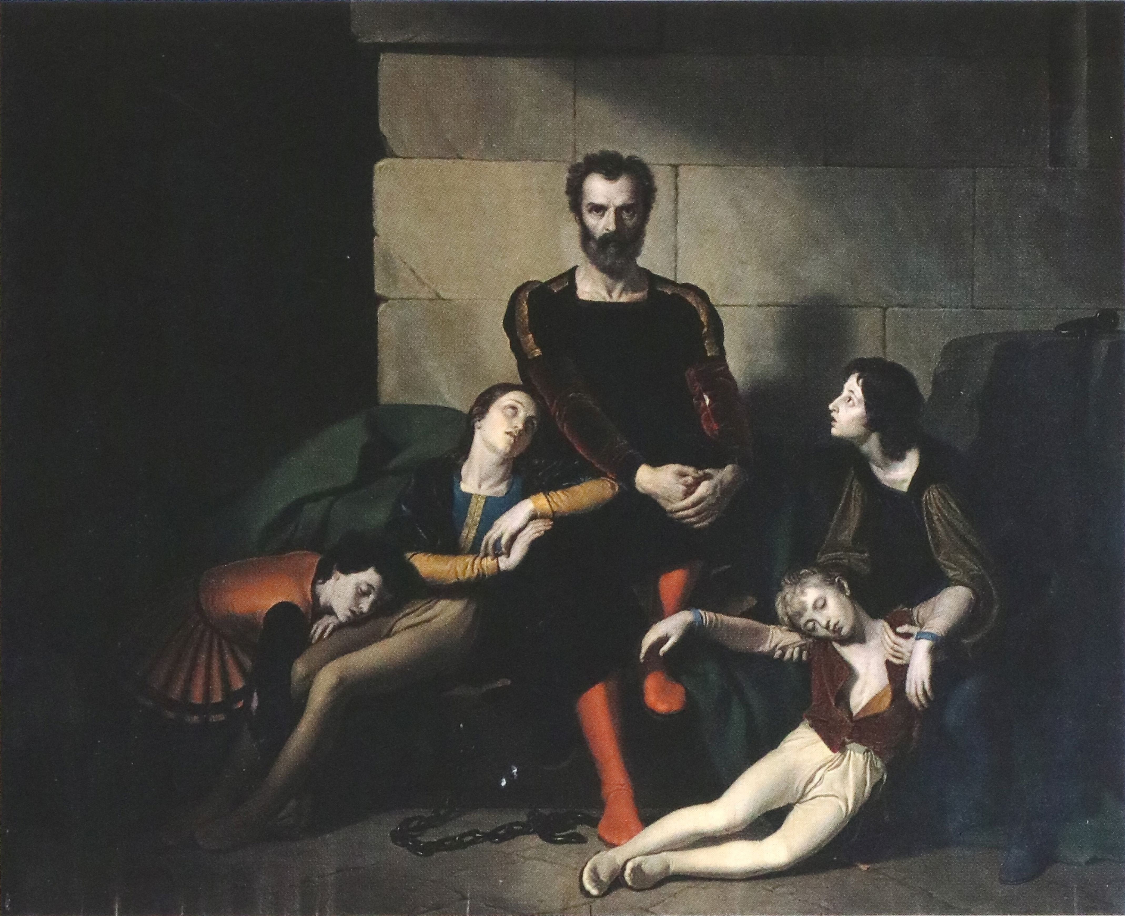 На полотне Джузеппе Диотти «Граф Уголино в башне» (ок. 1820, Городской музей истории искусства, Брешия) (ил. 4) изображен эпизод из Тридцать третьей песни «Ада» «Божественной комедии». Знатный гибеллин[1], капитан и подестá Пизы был заточен недругами в башню с сыновьями и внуками из-за обвинения епископом Руджиери в измене. В «Аду» Данте явилась душа Уголино, с которой беседует поэт: «В лицо детей я устремил безмолвный / Суровый взор и сердце словно лед / В груди моей от ужаса застыло» [Данте Алигьери 2020, с. 126] <…> В предательстве виновен, может быть, / Но за отца зачем детей казнить» [Данте Алигьери 2020, с. 127], – пишет поэт. Джузеппе Диотти, как живописцу романтического направления, было важно передать драматизм сюжета, моральную стойкость в перенесении страданий Уголино. Полотно Диотти было выставлено в миланской Академии Брера и известный критик Доменико Сакки отметил в журнале «Европейское обозрение» (“Rivista Europea”) мастерство художника в передаче характеров, выбор им эффектного драматического сюжета [Selvatico 1839, с. 308–314].