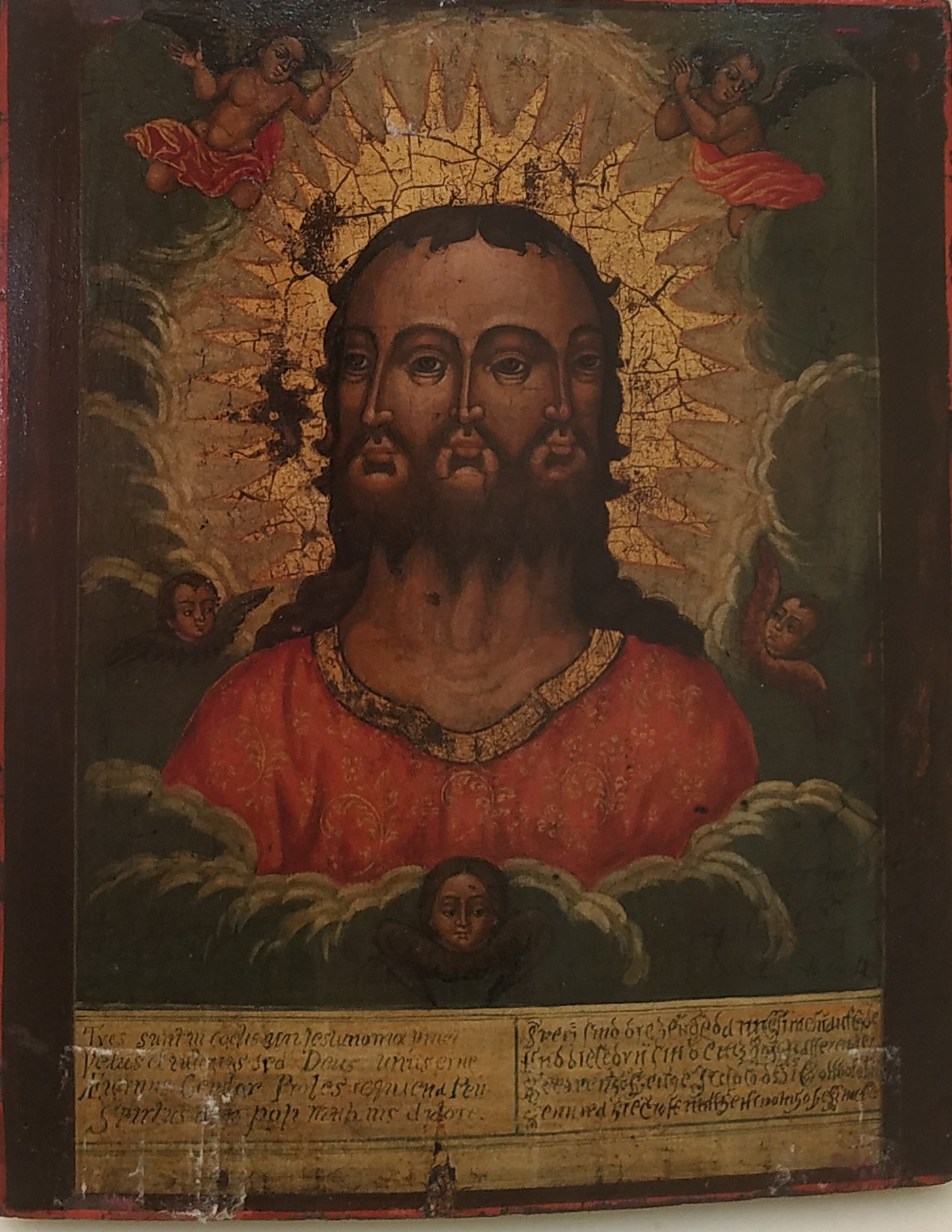 Предлагаемый нами взгляд на многократно обсуждаемую тему связан с вербальной составляющей иконы из собрания отдела древнерусской живописи Государственного исторического музея. Образ, выполненный в 1793 году, как свидетельствует пометка в правом нижнем углу лузги, в масляной технике, вероятно, с гравюрного немецкого образца (о чем свидетельствует правая часть билингвической надписи) – самый ранний из небольшой группы икон, хранящихся сегодня в фондах музеев Подмосковья и Санкт-Петербурга, а также упомянутых в каталожных описаниях киевского Церковно-археологического музея, публиковавшего свои труды в конце XIX – начале XX столетий, и в издававшемся в то же время в Москве «Вестнике изящных искусств». Возможно, икона из Государственного исторического музея с некоего времени своего бытования сама послужила исходным образцом для поздних копийных произведений. Из трех икон, хранящихся в фонде «Православие ИЗО» Государственного музея истории религии в Санкт-Петербурге (ГМИР) с изображением Троицы в образе Иисуса Христа с тремя ликами[7], обращает на себя внимание наиболее близкая к образу из московского собрания (ГМИАР, Инв. № А-22811-IV). Ее нижняя часть представляет собой декоративный фон как продолжение поля иконы. Надпись на поле отсутствует. Как и у многих памятников в ГМИР, происхождение иконы описано условно. По номерам Центрального антирелигиозного музея (ЦАМ) можно заключить только то, что это ранние поступления 1930-х годов. Номера перечеркнуты, и их несколько, они четырехзначные, это подтверждает, что икону можно причислить к первым пяти или шести тысячам памятников, поступившим в музей. Все номера «глухие», установить, откуда она поступила в ЦАМ, невозможно.