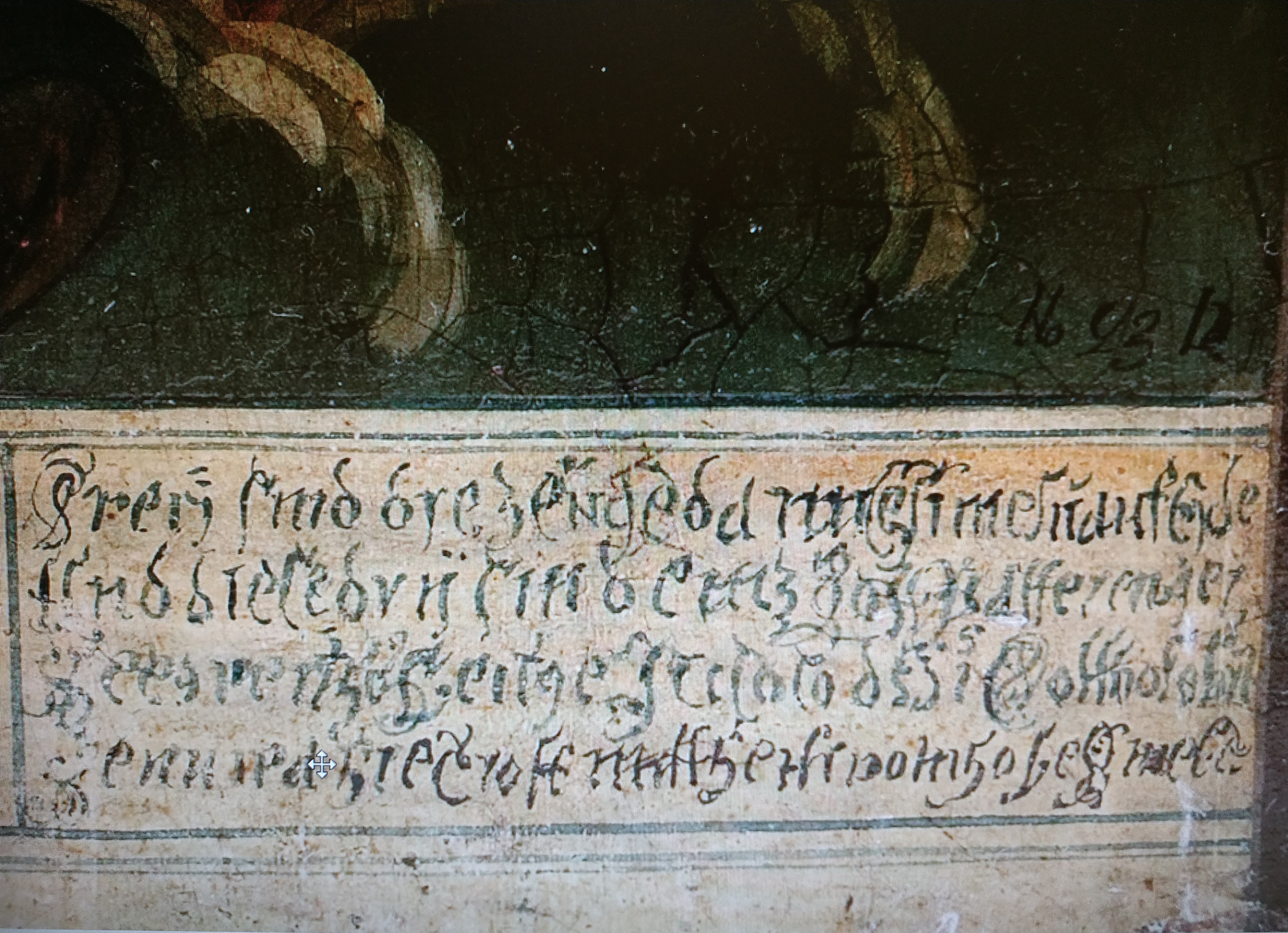 Интересно, что последние слова двустиший частично скрыты. Как небезосновательно считал Хенк ван де Йонге, профессор Лейденского университета, использование possessive dative в четвертой строке латинского текста было бы отражением доктрины филиокве. Панель с текстом на иконе, безусловно, поновлялась и, вероятнее всего, не единожды. Сейчас есть серьезное повреждение четвертой строки латинского текста и сильного искажения всего немецкого текста (ил. 3). Он тоже не прямая цитата из Библии (Лютера) и, возможно, тоже имеет признаки стихотворного, однако буквы читаются с трудом, и пока нельзя быть до конца уверенными в верности прочтения, приводим только безусловно прочитанное: